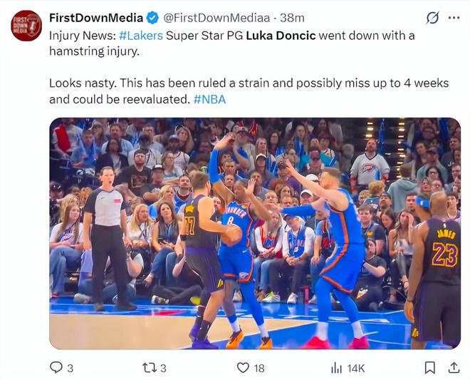 根据美媒FDM的说法,伤病消息,湖人球星东契奇因为左腿筋拉伤退场,看起来情况停糟糕,这至少会被判定轻微拉伤可能需要4周的康复时间,并且是四周后重新评估。(东契奇这次的伤势还会影响他评奖,他还差1场才打满65场)